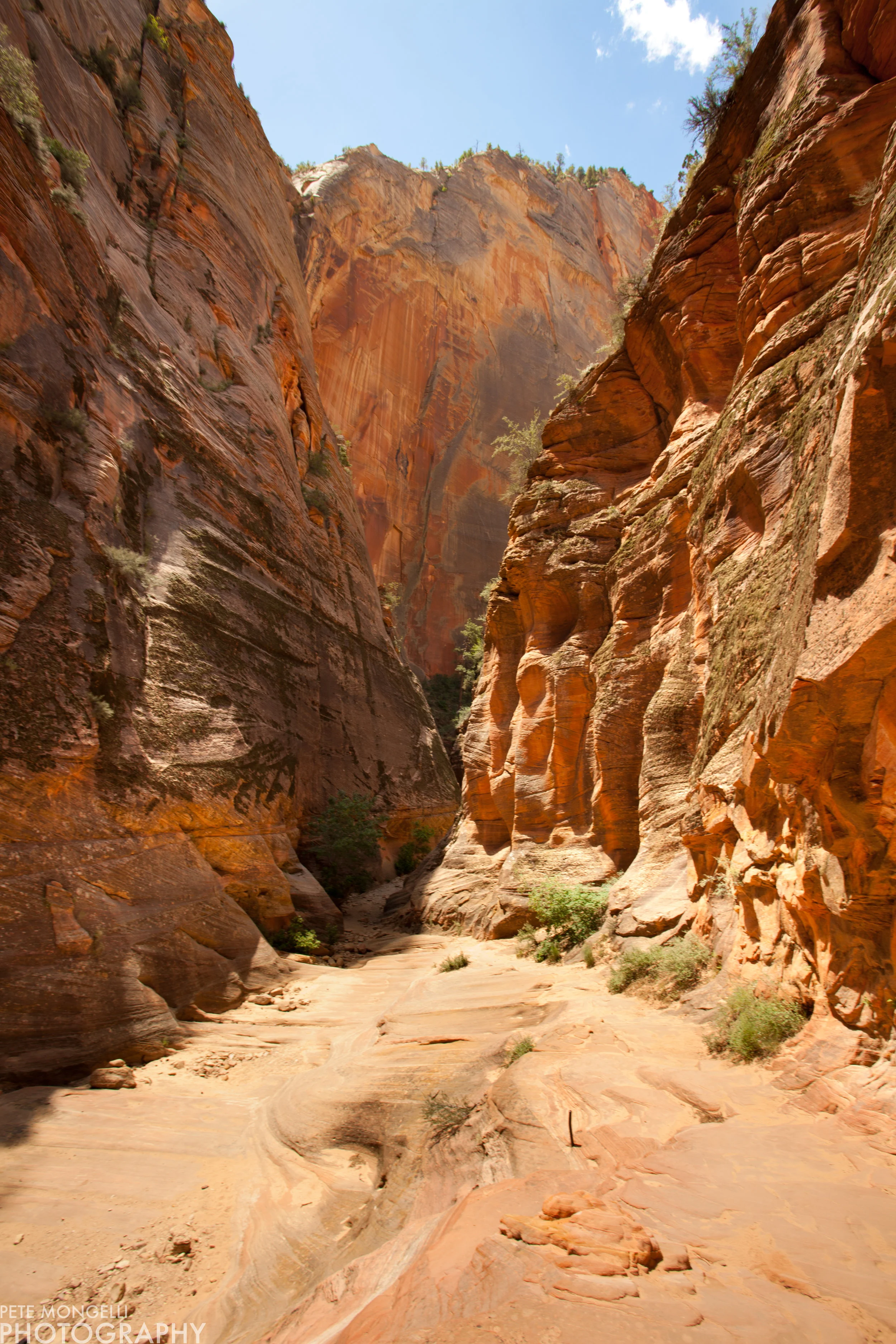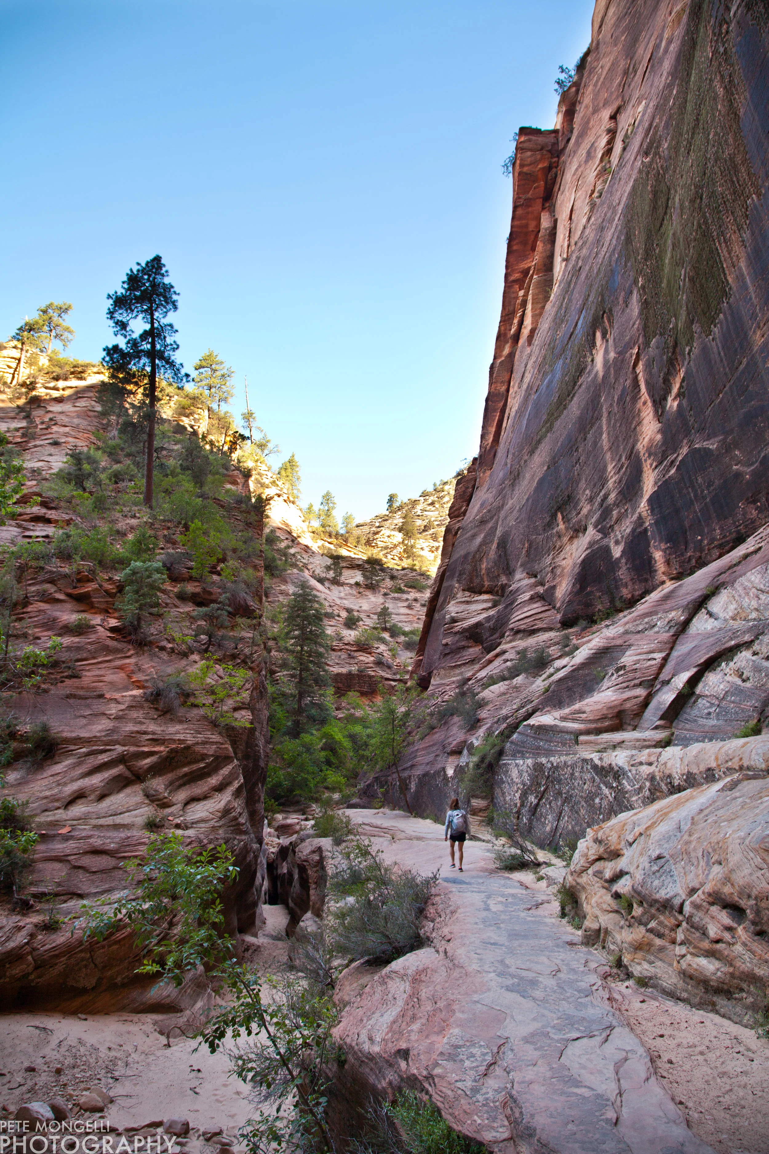 At the farthest end of the Zion National Park road lie the Narrows. Here, the expansive canyon walls close in to their most confined point. There is a 1 mile footpath from the main road to the entrance of the Narrows, after which, you enter the Virgin River and literally hike upstream.