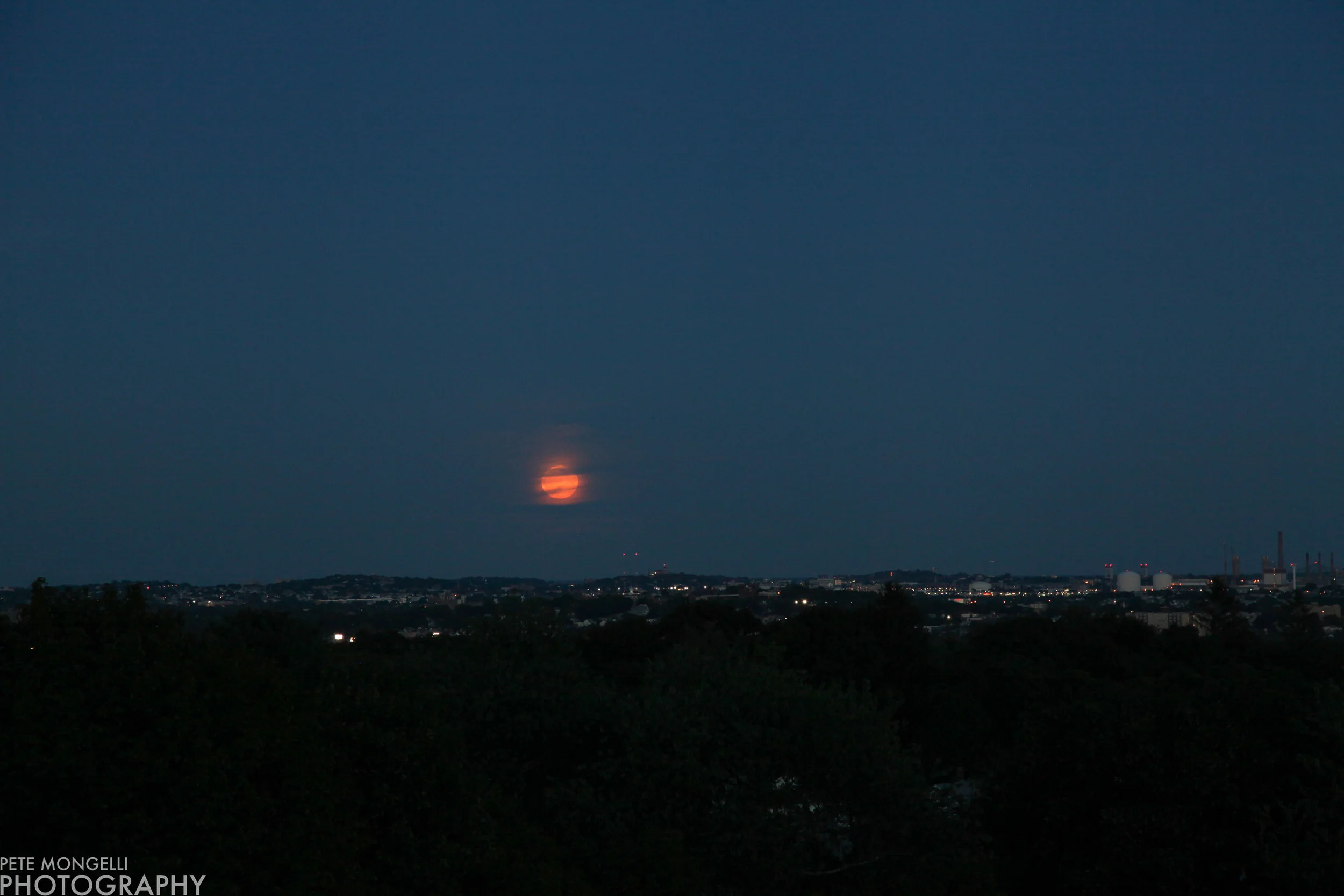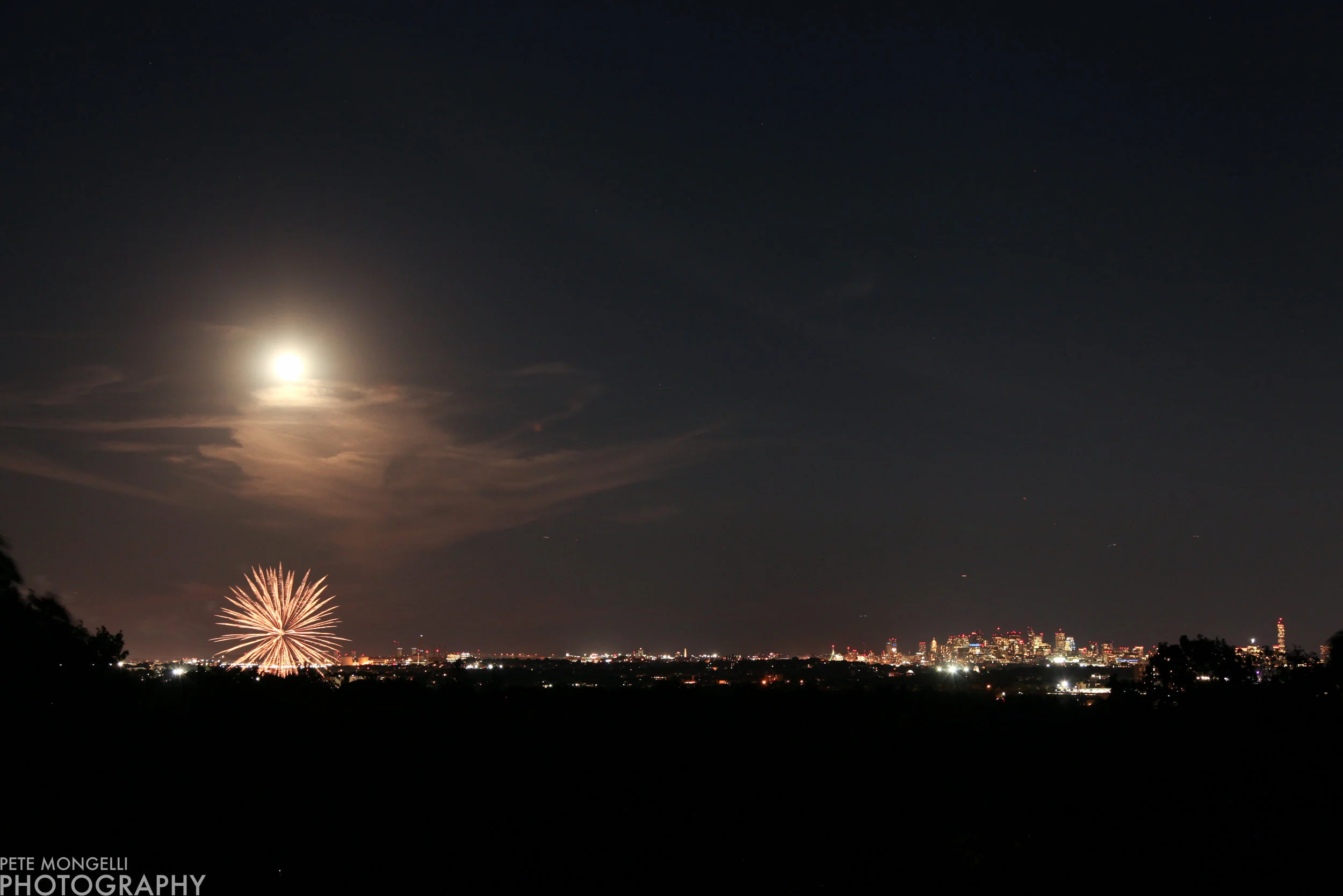 The moon began rising a bit north of the city and there were some hazy clouds moving through. Although I wasn't in a great position to get the shot I wanted with the Boston skyline, it was still fun to watch the show. There were a lot of people enjoying the view at the same time and when most started to pack up and walk away (myself included), a fireworks show began right under the rising moon!
