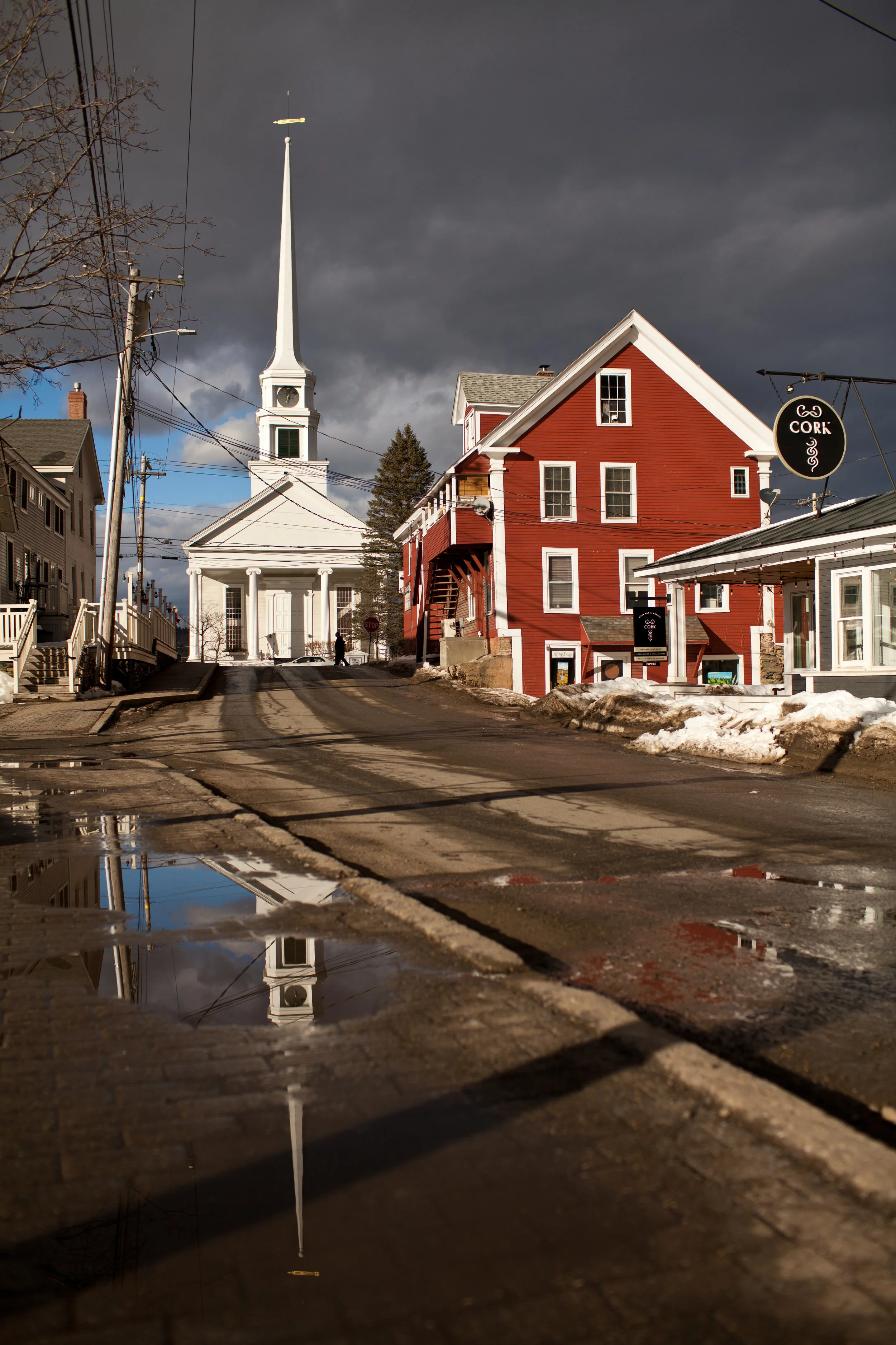 The more traditional church is Stowe Community Church, located in the heart of Stowe. It had just rained earlier and the sun was beginning to shine through. I spotted a puddle that provided a great reflection of the steeple.
