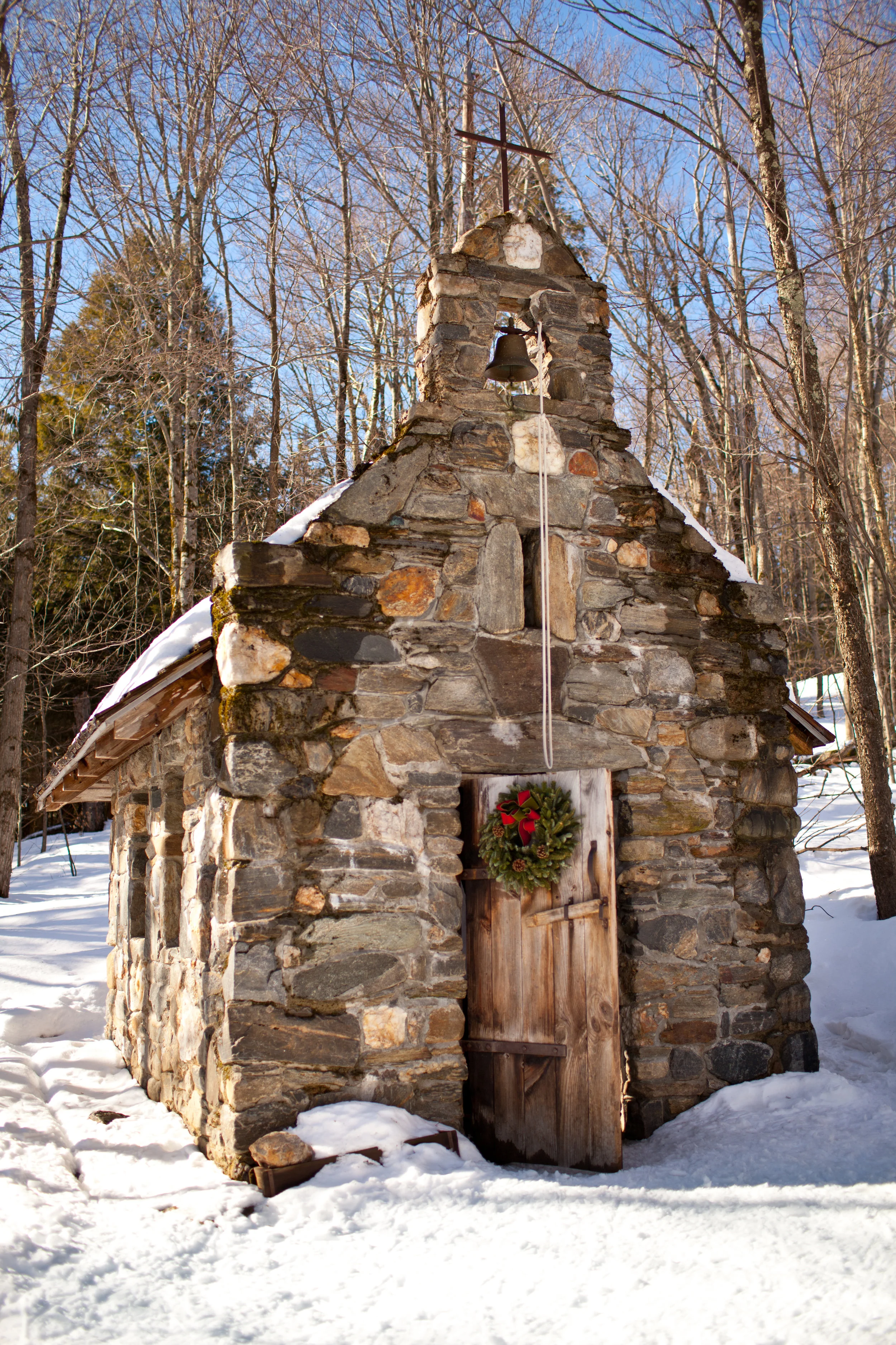 The stone chapel was built by Werner Von Trapp in the late 1940s after returning from the war. It's situated deep in the woods, on a hillside. We snowshoed up to the location and ventured through the forest after.